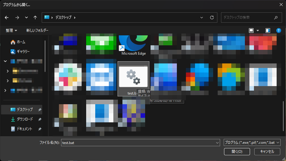 2.選択画面が表示されるので、ここで「test.bat」を選択します。