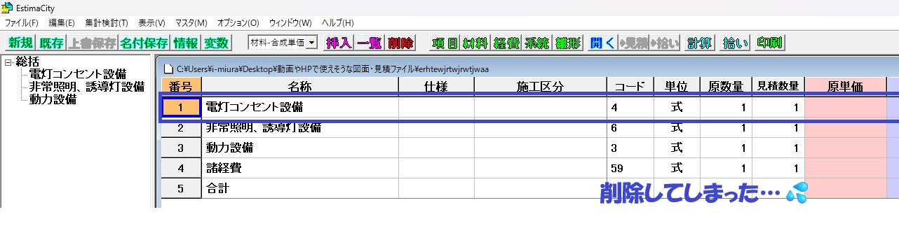 「EstimaCityで見積もりを作っていたら、行を間違えて1行削除してしまった…」