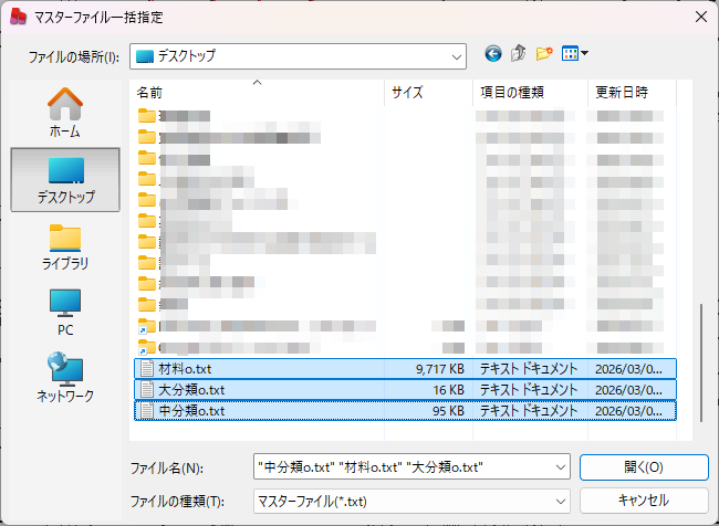 3.テキストの選択画面が表示されるので、手順➀で保存したEstimaCityのマスタテキストファイルを選択し、「開く」をクリックします。