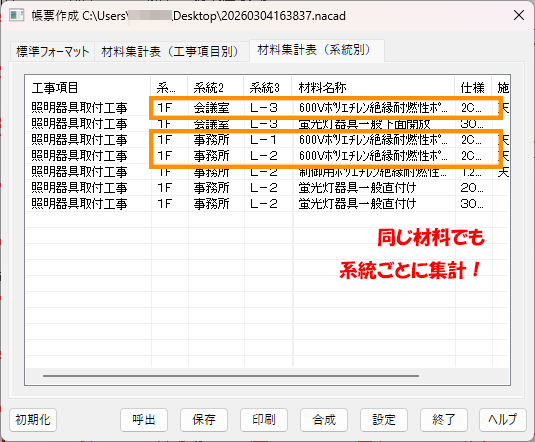 系統別の数量合算に対応し、系統別で材料ごとに集計できるようになりました