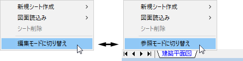 シートタブを右クリックして表示されるポップアップメニューから、図面ファイルの読み込みモード(編集/参照)を切り替えられるようになりました。