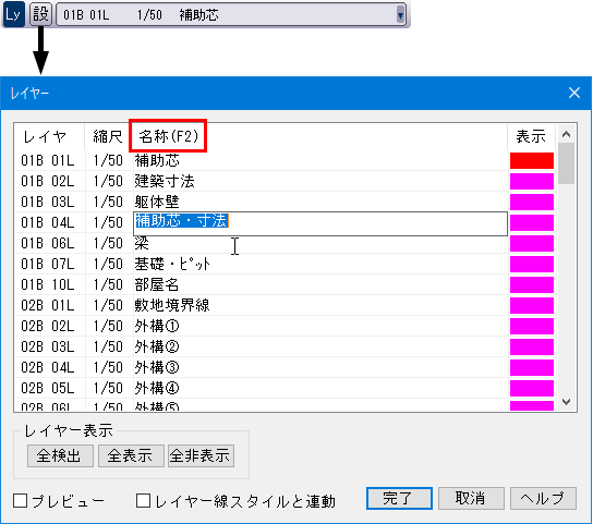 レイヤー操作の設定ダイアログボックスでレイヤー名称を編集する際に、[F2]キーで文字入力状態に移行できるようになりました。