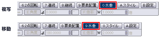 複写もしくは移動先の方向を、水平または垂直に固定できる「水垂」ボタンを追加しました。従来は「X増」または「Y増」の値を0に設定する必要がありました。本バージョンより、ボタン一つで切り替える事ができます。