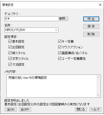 システムの基本設定や出図設定、キー定義やマウスアクションなどを、任意のフォルダーにまとめて保存・呼び出しできる機能を追加しました。複数台のセットアップや、新しいPCへの移行などで役立つ機能です。